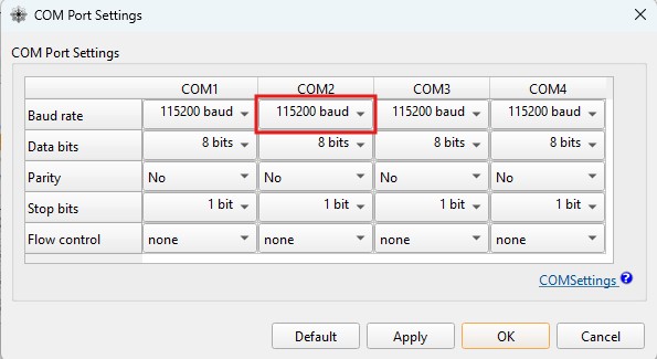 1. Set the Baud rate of COM2 at 115200 bps, because most of our communication plug-in works at 115200 bps. Press OK.