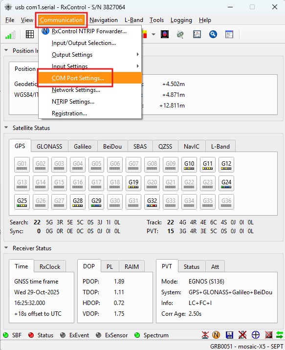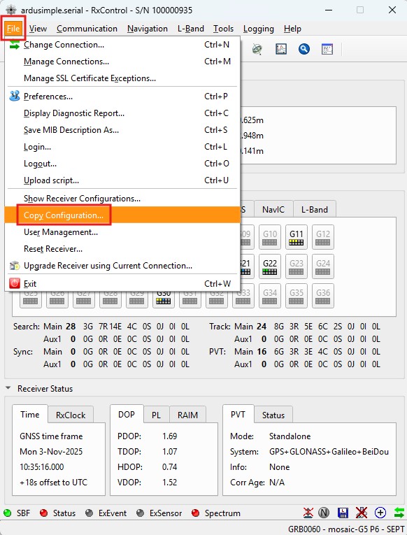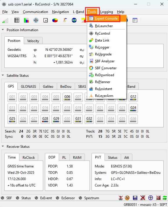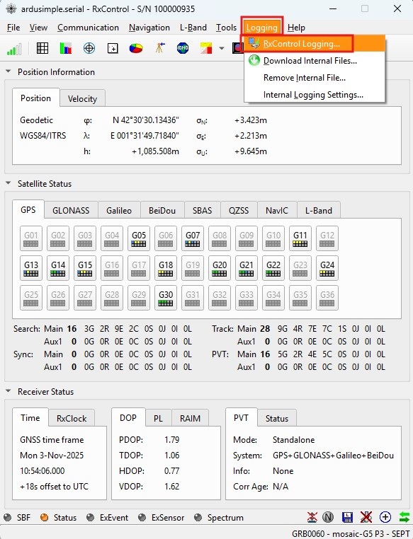 1. While connected to your Septentrio G5 receiver via USB you can use RxTools to log data into your PC drive. Go to main menu Logging -> RxControl Logging…