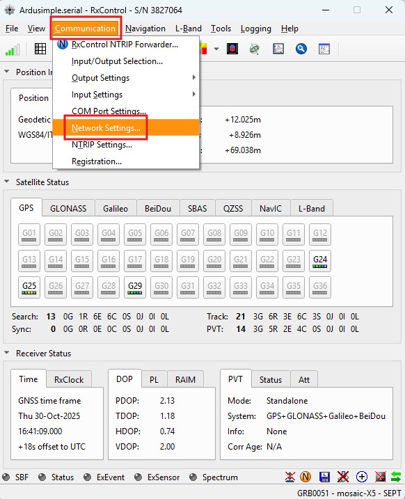 1. To share your internet connection with the GNSS receiver over USB and receive RTK corrections, go to RxControl main menu Communication -> Network settings…