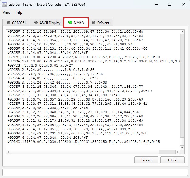1. Go to the NMEA tab in the Expert Console. You will observe the output NMEA messages.