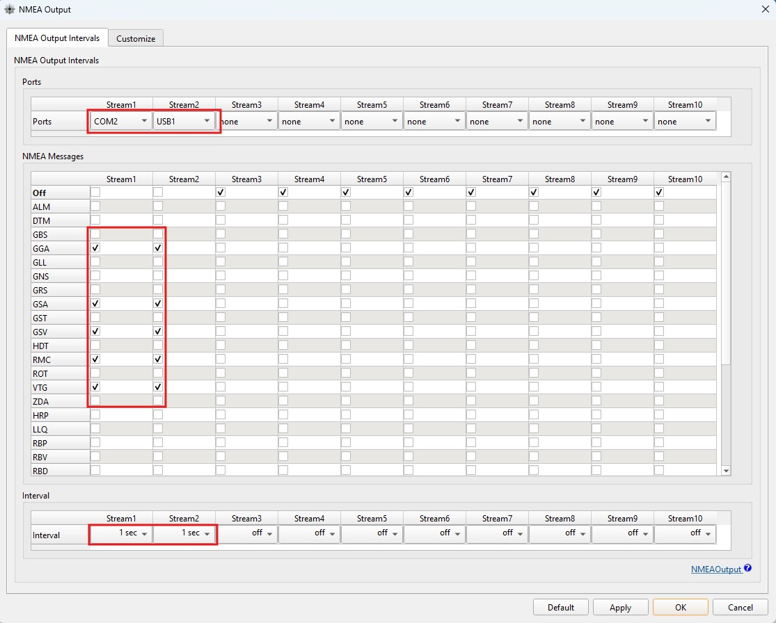• Enable on USB1, COM1, COM3: GGA, GST, GLL, GSA, GSV, RMC, VTG with 1s