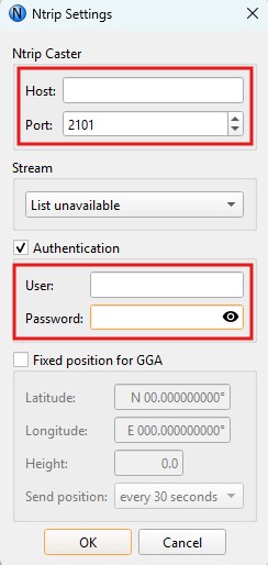 1. In the Ntrip Settings dialog fill in caster settings: Host, Port, user name and password of the NTRIP account. This data should be provided by the NTRIP service when you register your account. Press OK.