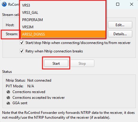 1. If the NTRIP account credentrials were entered correctly, the Stream drop-down list will become active and the RTK correction Mount Point can be selected. Press Start.