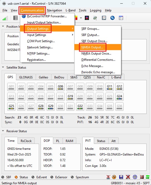 1. In the main menu bar select Communication -> Output settings -> NMEA Output.