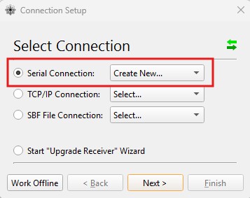 1. Open the RxControl app and create a new Serial Connection. Press Next.