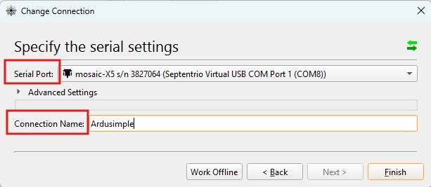 1. Specify the computer Serial Port you want to use to connect to your mosaic-G5 receiver and enter a Connection Name. Press Finish.