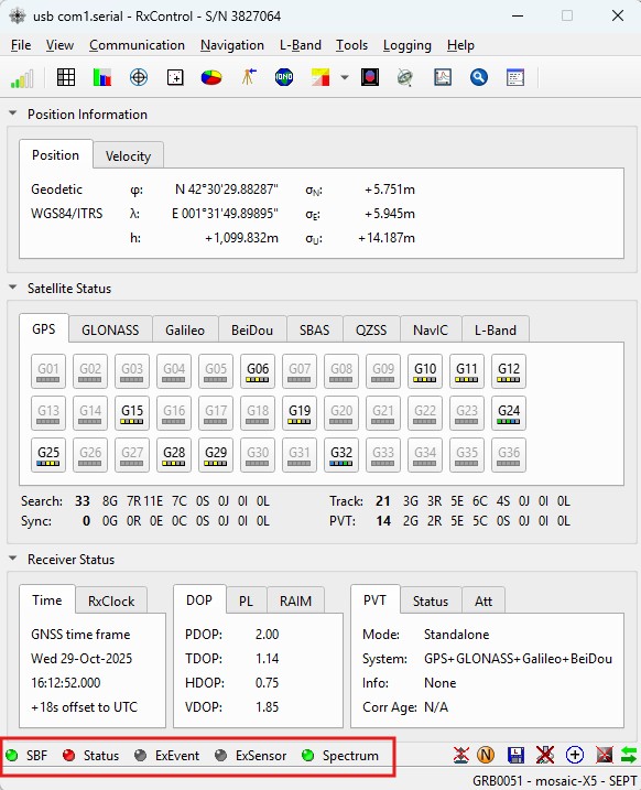 1. The RxControl GUI will open and the Status Bar at the bottom will display information about the connection status, with blinking lights confirming the connection with your receiver and data streaming from it.