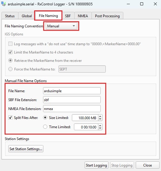 1. At the File Naming tab choose Manual File Naming Convention to type manually a common File Name and File Extension for both SBF and NMEA log files, and whether to Split Files After a specified file size or time limit is reached.