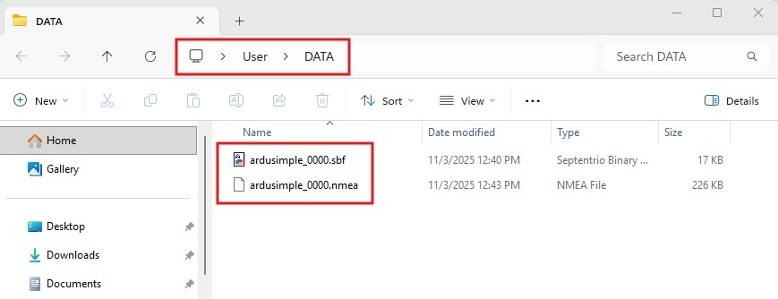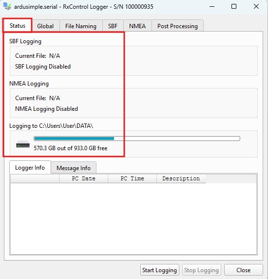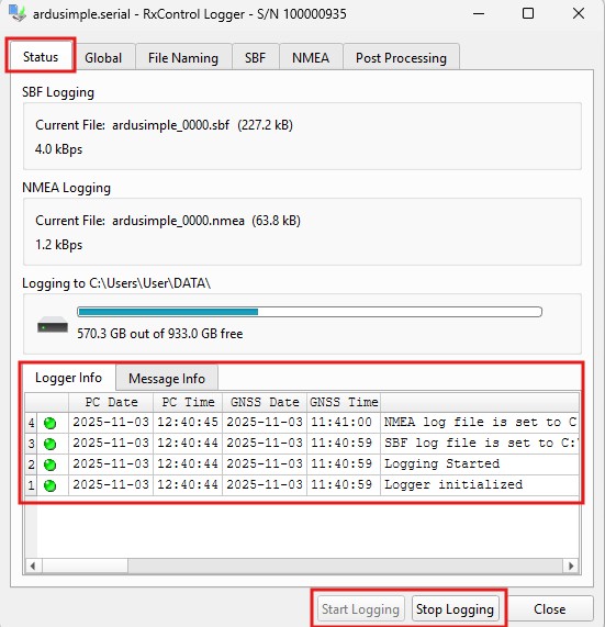 1. Press Start Logging button to start logging the files, and you will find them in the designed PC drive folder. You can use your preferred tool to analyse the saved NMEA log files, and for SBF log files we recommend using RxTools SBF Analyzer. Press Stop Logging once you are done logging the receiver data.