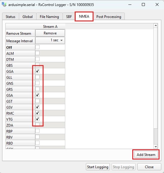 1. At the NMEA tab press Add Stream button to create a new stream, and activate the NMEA messages you want to log, usually GGA, GST, GSV and VTG.