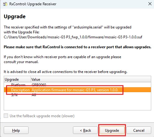 1. A resume of the Upgrade Receiver settings will be displayed. Press Upgrade.