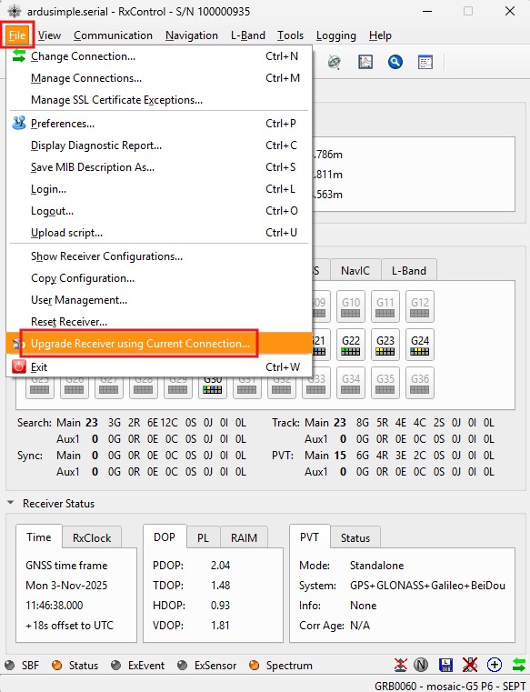 1. Go to main menu File -> Upgrade Receiver using Current Connection…