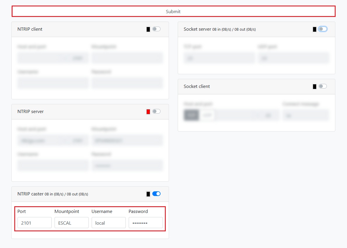 - At NTRIP Caster set Port to 2101 and enter your preferred Mountpoint, Username, and Password. Click Submit to apply the changes.