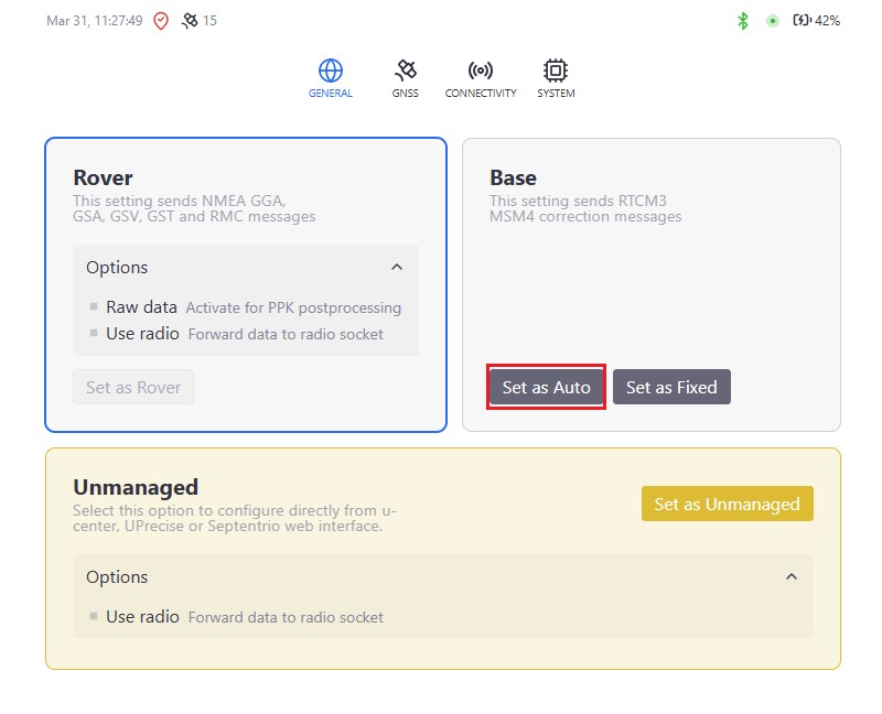 If you do not know the exact coordinates of your location, click Set as Auto to let the RTK Smart Antenna automatically determine the base position. In this tutorial, we will use Set as Auto mode, which provides high relative accuracy between the base and the drone.