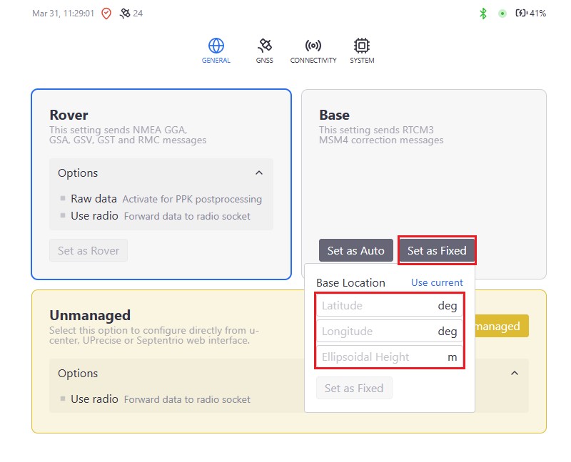 - Now we will configure your RTK Smart Antenna as an RTK base station. If you know the precise coordinates of your base station (for example, when it is placed on a geodetic reference point), you can enter them manually by clicking Set as Fixed. This option provides absolute, survey-grade accuracy.