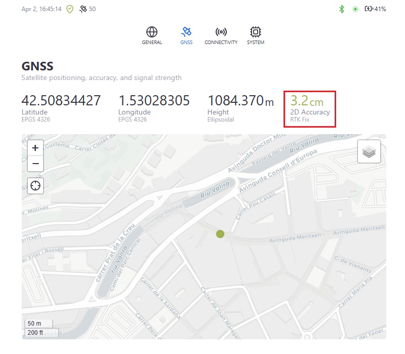 - You can find the accuracy of the corrections sent by the base station beside its current coordinates.