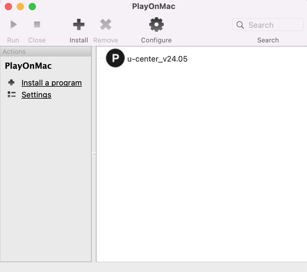 - Open PlayOnMac. Select u-center and click Run on the left menu.