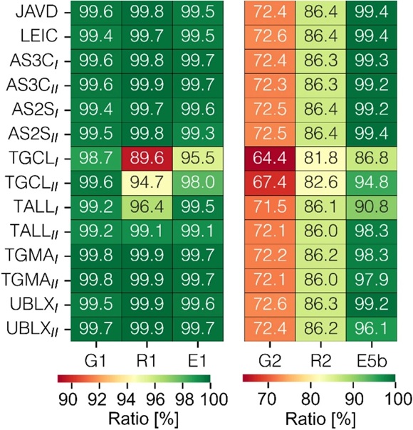 4. ArduSimple antennas maintain high acquisition ratios on primary frequencies (L1/E1/E5b), performing consistently within the top tier of the tested low-cost antennas.