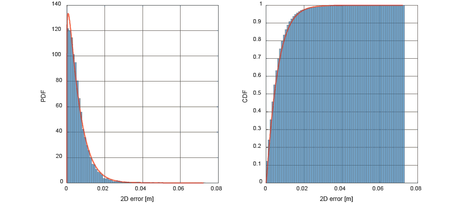 For each of the 12510 points, the error wrt the real position has been calculated and this is its histogram PDF and CDF, fitted with a Weibull distribution: