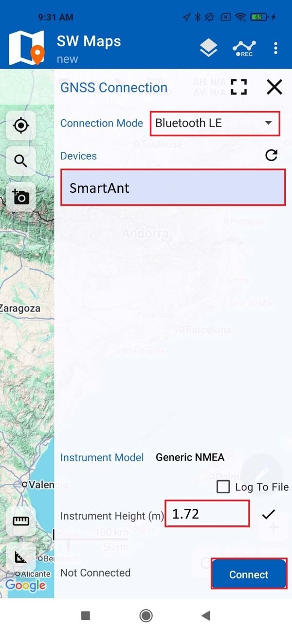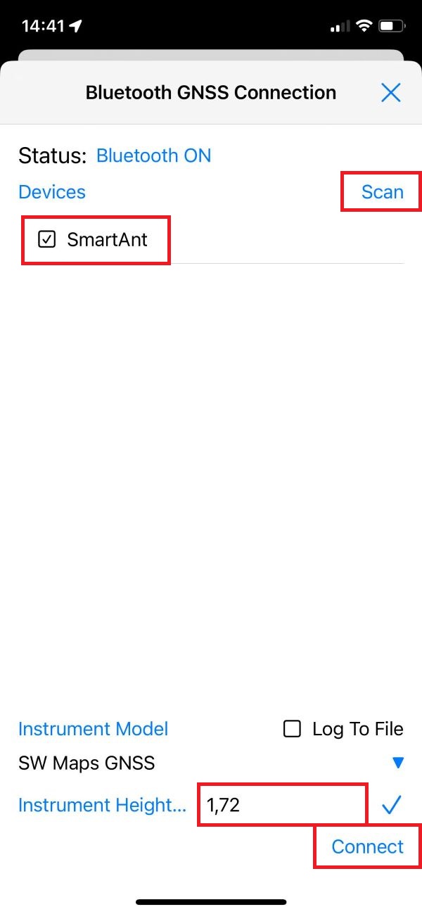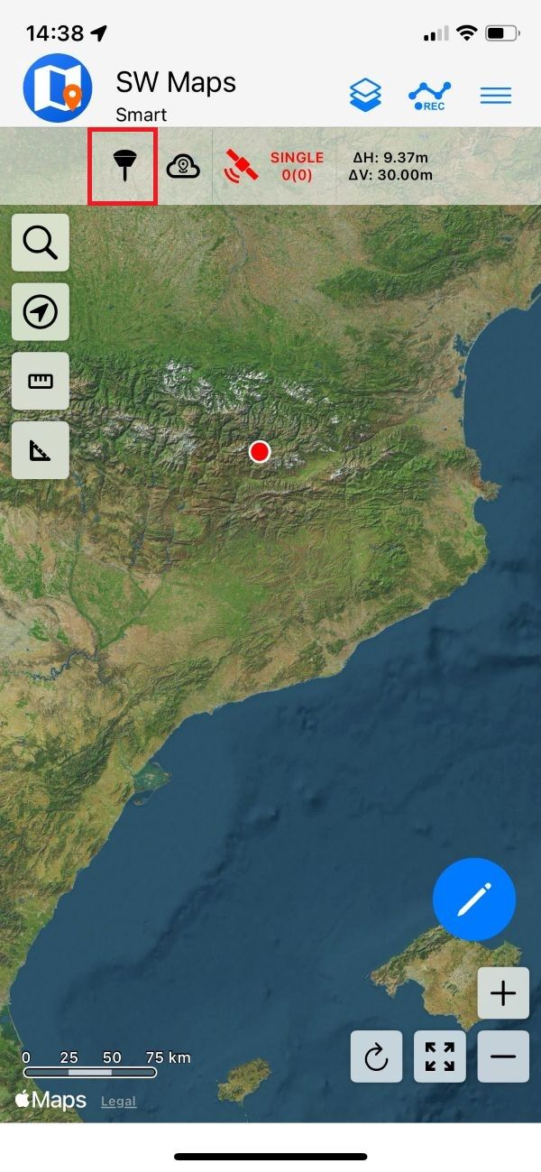 In SW Maps, tap the antenna icon to open the GNSS Connection menu.