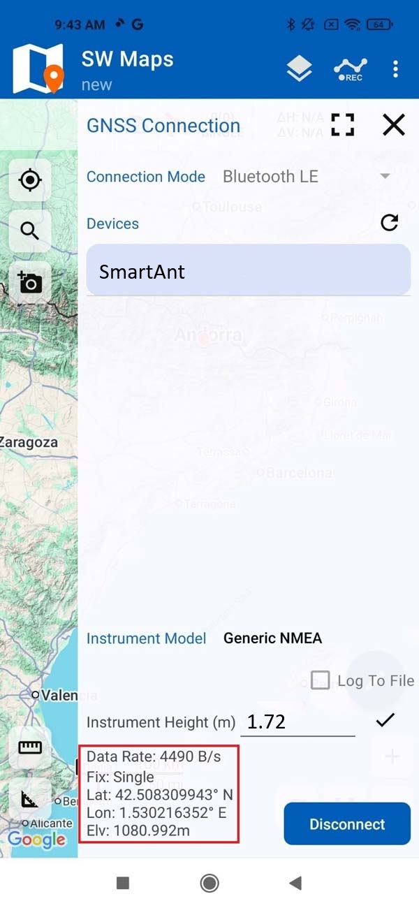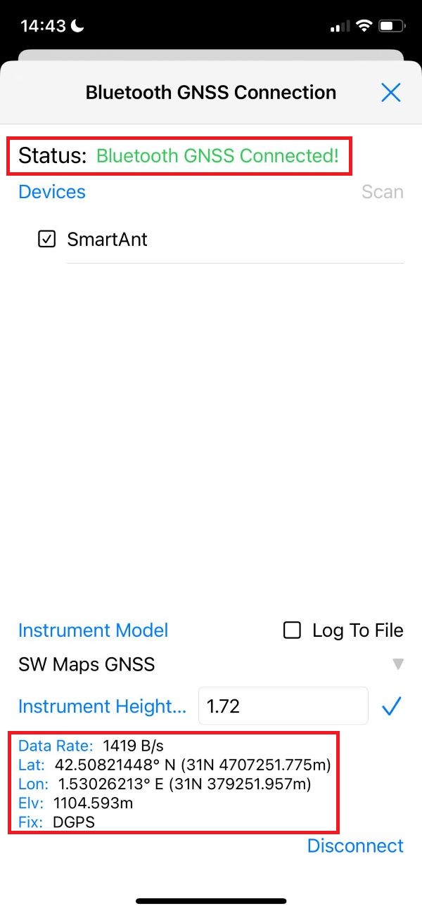 You should now see a confirmation of a successful connection and data transfer from the RTK Smart Antenna.