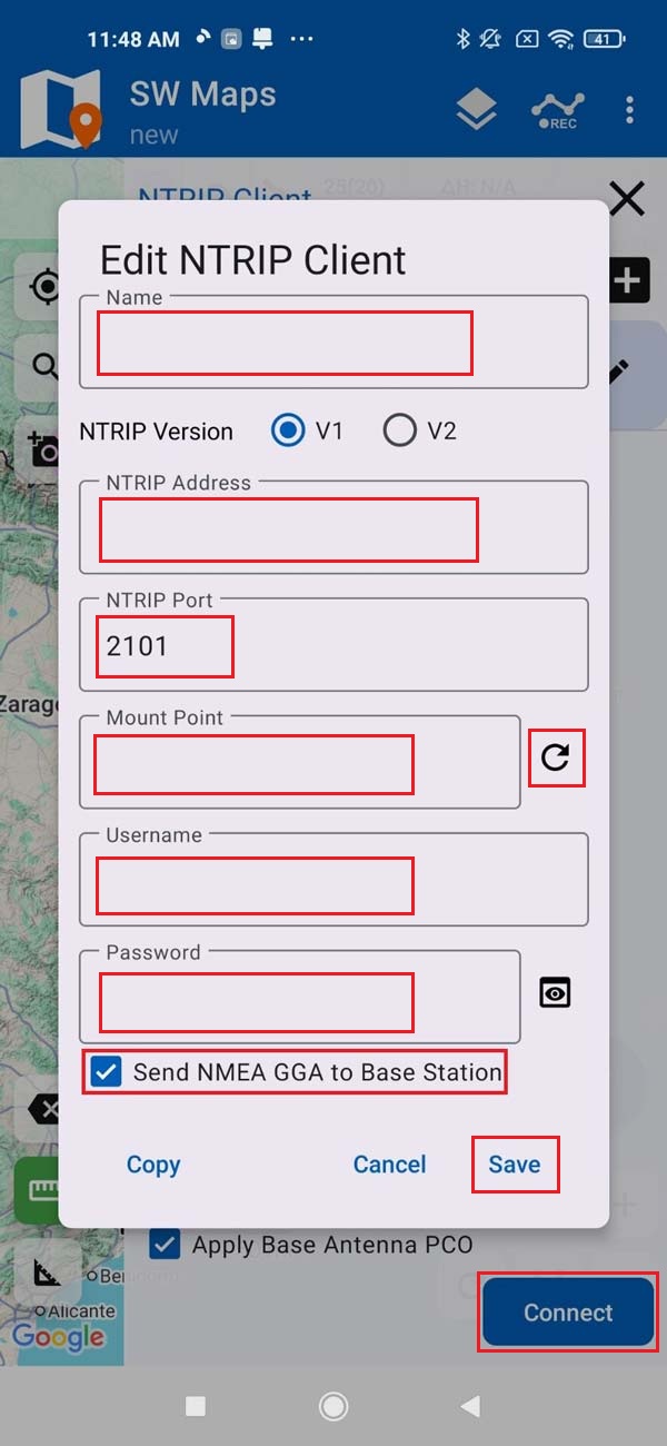 - Enter your NTRIP Client credentials: Name, NTRIP Port, Mount Point, Username and Password. We recommend enabling Send NMEA GGA to Base Station option to send your location to the NTRIP caster.