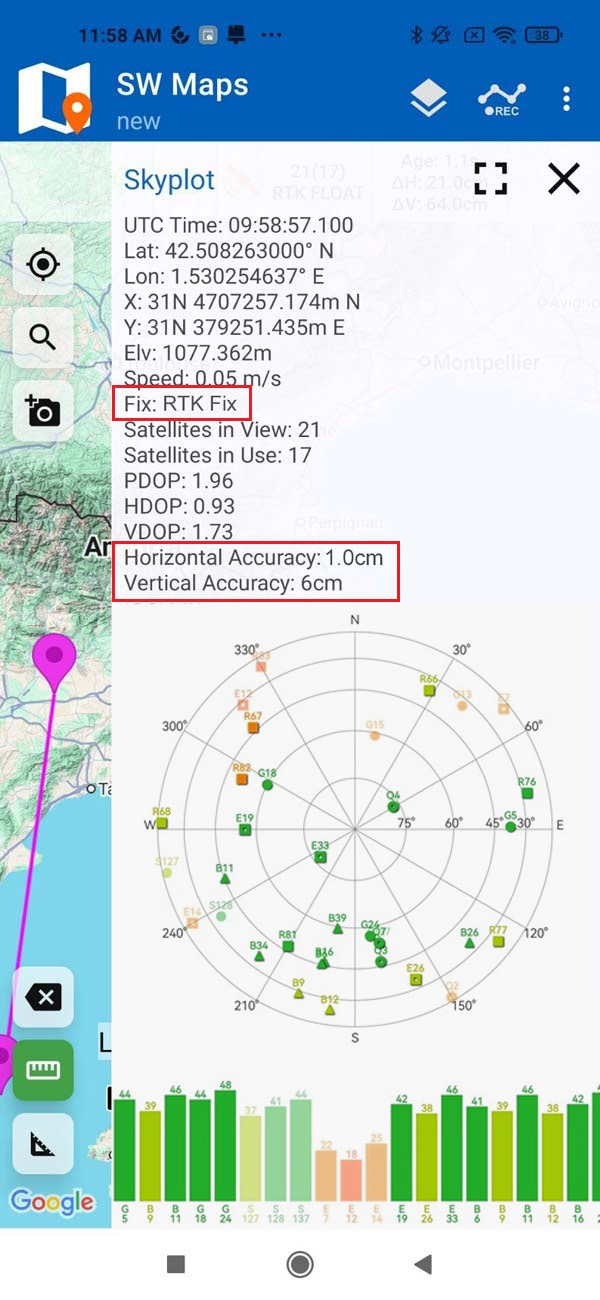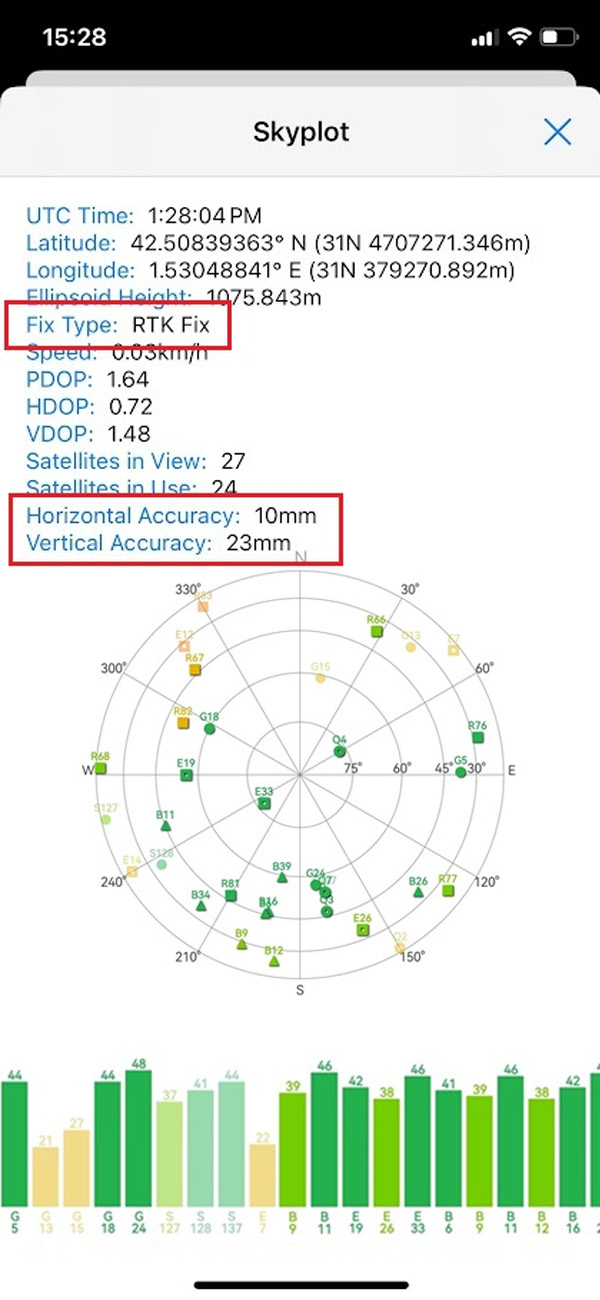 - Navigate back to the SW Maps main menu and tap Skyplot. You should now see the number of available satellites at your position, Fix status to RTK Float/Fix, and millimeter-level horizontal and vertical accuracy.