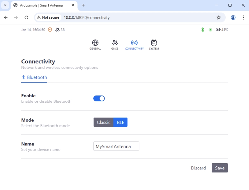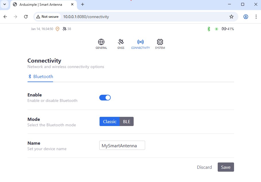 The Connectivity section of the web interface is used to configure the connection (Bluetooth) used between the RTK Smart Antenna and mobile devices used in surveying tasks.