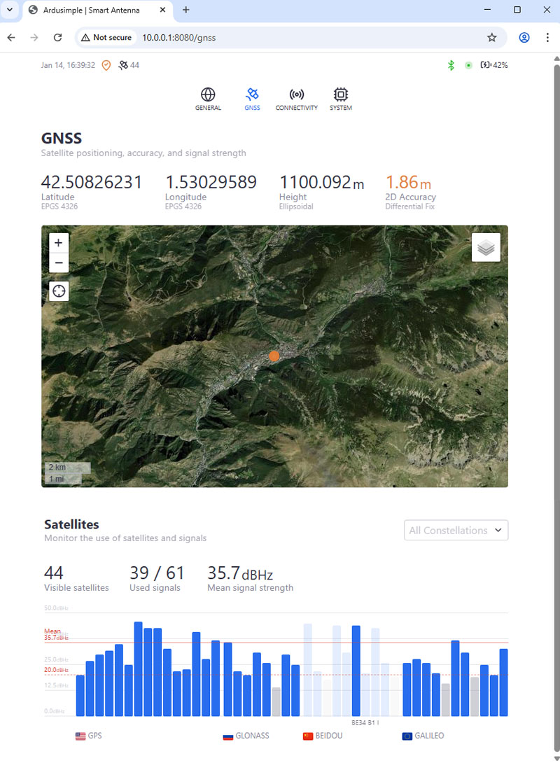 The GNSS section of the web interface is used to monitor the satellite signal status, quality, and the position fix resolved by the RTK Smart Antenna’s internal receiver.