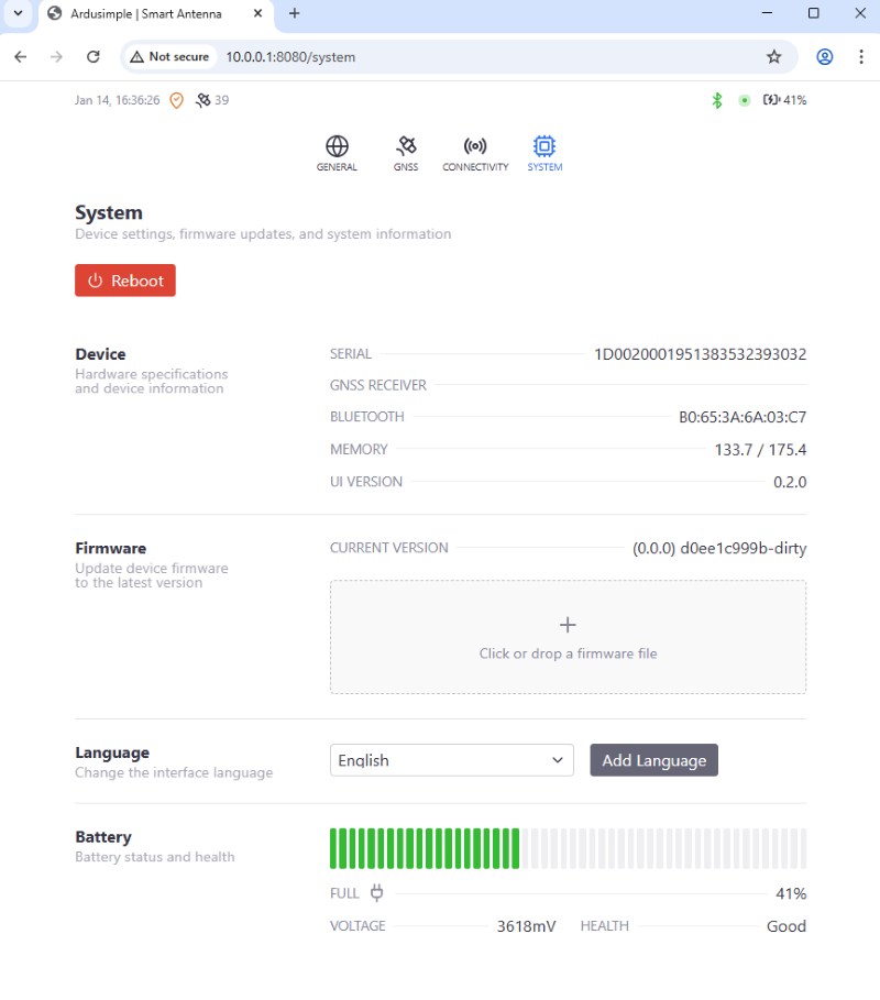 The RTK Smart Antenna will restart automatically. Once ready, if you refresh the web interface system page, you should see the new firmware version displayed. After that, you can safely disconnect the unit from your PC.