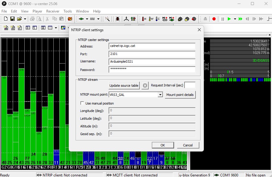The NTRIP Status section will show a confirmation of a successful connection and active data streaming to your device.