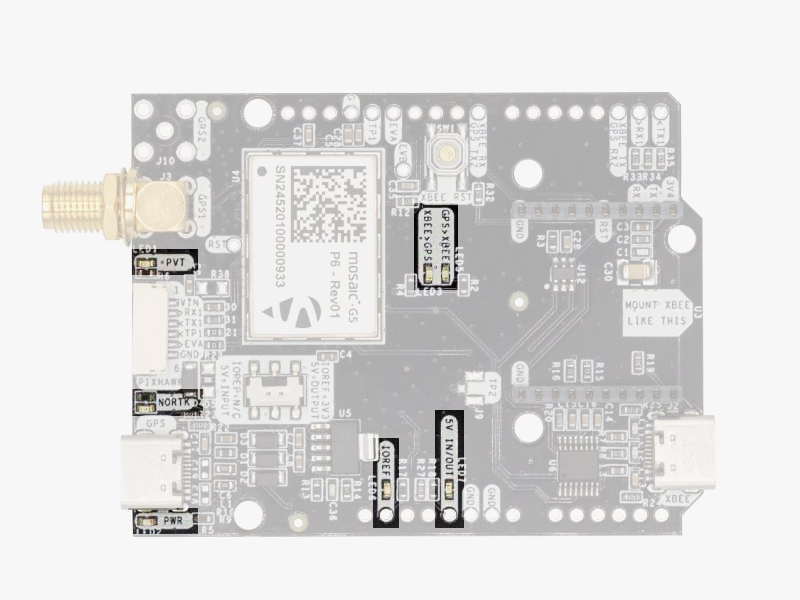 • GPS>XBEE: The Mosaic is outputting data that the XBEE radio is receiving and sending over the air.