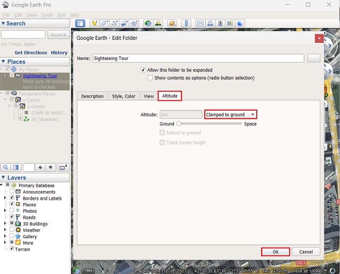 From the new window, go to Altitude and change from Absolute to Clamped to ground.